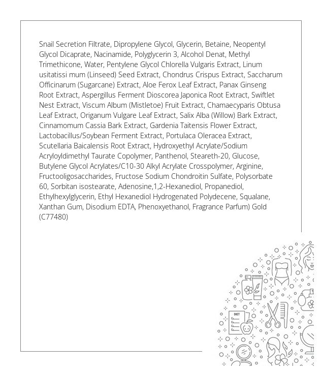 Skin79 Golden Snail ist eine völlig neue, luxuriöse Anti-Aging-Linie für Frauen, die starke Regeneration, sichtbare Effekte und maximalen Komfort bei der Verwendung des Produktes benötigen. Die drei Grundbestandteile aller Kosmetika aus der Golden Snail Linie ist der Schneckenschleim, der regenerierende, verjüngende, glättende, beruhigende und feuchtigkeitsspendende Eigenschaften hat. Er ist sehr effektiv im Kampf gegen Unvollkommenheiten. Der Schneckenschleim verlangsamt den Alterungsprozess und unterstützt die Heilung von Wunden. Außerdem finden wir hier den Extrakt aus rotem koreanischem Ginseng, der Ihre Haut glättet und Vitalität verleiht. Er hat erneuernde und regenerative Eigenschaften. Er ist auch reich an Vitaminen, Mikroelementen, organischen Säuren und wirkt stark verjüngend. 24 Karat Gold wirkt gegen Falten und aufhellend. Eine einzigartige Formel, die viele Hautprobleme löst.