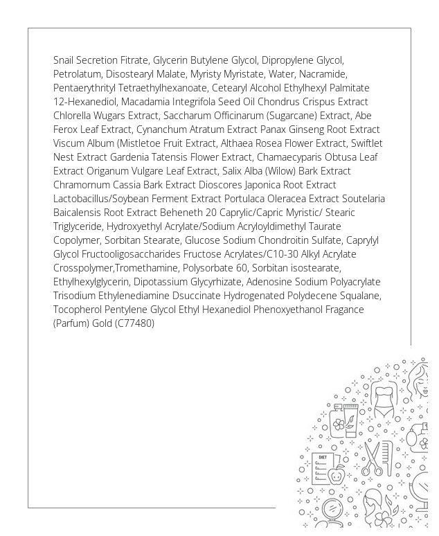Ingredients: Snail Secretion Filtrate (560,000ppm), Glycerin, Butylene Glycol, Dipropylene Glycol, Petrolatum, Diisostearyl Malate, Myristylmyristate, Cyclopentasiloxane, Niacinamide, Pentaerythrityl Tetraethylhexanoate, Cetearyl Alcohol, Ethlhexyl Palmitate, Cyclohexasiloxane, 1, 2-Hexanediol, Macadamia Integrifolia Seed Oil, Macadamia Ternifolia Seed Oil, Aloe Ferox Leaf Extract, Panax Ginseng Root Extract, Swiftlet Nest Extract, Viscum Album (Mistletoe) Fruit Extract, Gardenia Tahitensis Flower Extract, Gold (Ci 77480) (0.003mg), Disoscorea Japonica Root Extract, Origanum Vulgare Leaf Extract, Salix Alba (Willow) Bark Extract, Chamaecyparis Obtusa Leaf Extract, Portulaca Oleracea Extract, Scutellaria Baicalensis Root Extract, Lactobacillus/Soybean Ferment Extract, Cinnamomum Cassia Bark Extract, Behen Eth-20, Caprylic/Capric/-Myristic/Stearic Triglyceride, Hydroxyethyl Acrylate/Sodium Acryloyldimethyl Taurate Copolymer, Sorbitan Stearate, Sodium Chondroitin Sulfate (1,990ppm), Dimethicone Crosspolymer, Caprylyl Glycol, Acryl Ates/ C10-30 Alkyl Acrylate Crosspolymer, Tromethamine, Ethylhexyglycerin, Dipotasium Glycyrrhizate, Adenosine, Sodium Polyacrylate, Water, Polydecene, Ceramide 3, Phytosphingosine, Squalane, Pentylene Glycol, Ethyl Hexanediol, Disodium Edta, Phenoxyethanol, Fragrance (Parfum)
