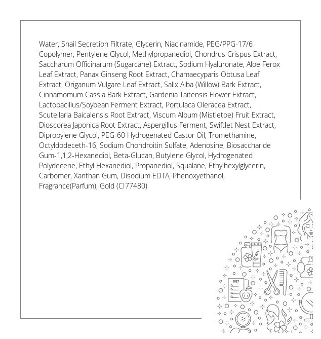 Skin79 Golden Snail ist eine völlig neue, luxuriöse Anti-Aging-Linie für Frauen, die starke Regeneration, sichtbare Effekte und maximalen Komfort bei der Verwendung des Produktes benötigen. Die drei Grundbestandteile aller Kosmetika aus der Golden Snail Linie ist der Schneckenschleim, der regenerierende, verjüngende, glättende, beruhigende und feuchtigkeitsspendende Eigenschaften hat. Er ist sehr effektiv im Kampf gegen Unvollkommenheiten. Der Schneckenschleim verlangsamt den Alterungsprozess und unterstützt die Heilung von Wunden. Außerdem finden wir hier den Extrakt aus rotem koreanischem Ginseng, der Ihre Haut glättet und Vitalität verleiht. Er hat erneuernde und regenerative Eigenschaften. Er ist auch reich an Vitaminen, Mikroelementen, organischen Säuren und wirkt stark verjüngend. 24 Karat Gold wirkt gegen Falten und aufhellend. Eine einzigartige Formel, die viele Hautprobleme löst; die Fibroblasten werden zur Produktion von Kollagen stimuliert, die Unvollkommenheiten überwunden und die Produktion von Talg reguliert. Ihre Haut bekommt dadurch Spannung und Festigkeit. Skin79 Golden Snail Gesichtswasser hat eine aufhellende Wirkung und lindert Pigmentveränderungen. Hoher Gehalt an Niacin verbessert die Lipidbarriere der Epidermis, erhöht die Feuchtigkeit und stimuliert die Zellreparatur. Adenosin verhindert Entwicklung von Mimikfalten sowie den Kollagenabbau. Die verbesserte Formel bietet eine tiefere Ernährung. Für alle Hauttypen unabhängig vom Alter, perfekt für schlaffe, müde Haut mit Falten und Verfärbungen.